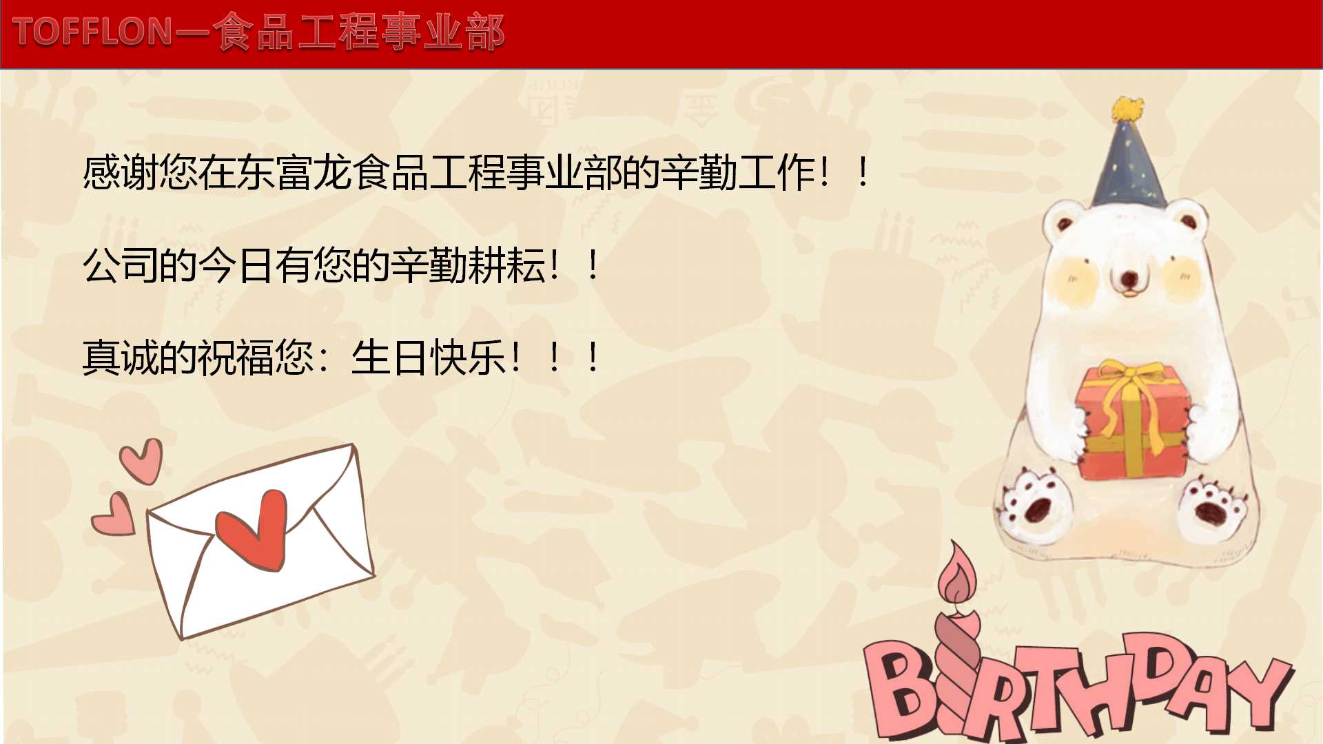 本次員工生日會的成功舉辦,也是公司致力于豐富員工業(yè)余生活、更加關(guān)愛員工的開始,相信在接下來的日子里,在東富龍食品事業(yè)部全體員工的共同努力下,一定會為公司營造一個團結(jié)協(xié)作、和諧融洽、積極向上、充滿斗志的工作氛圍,讓公司在未來的歲月里更創(chuàng)輝煌!