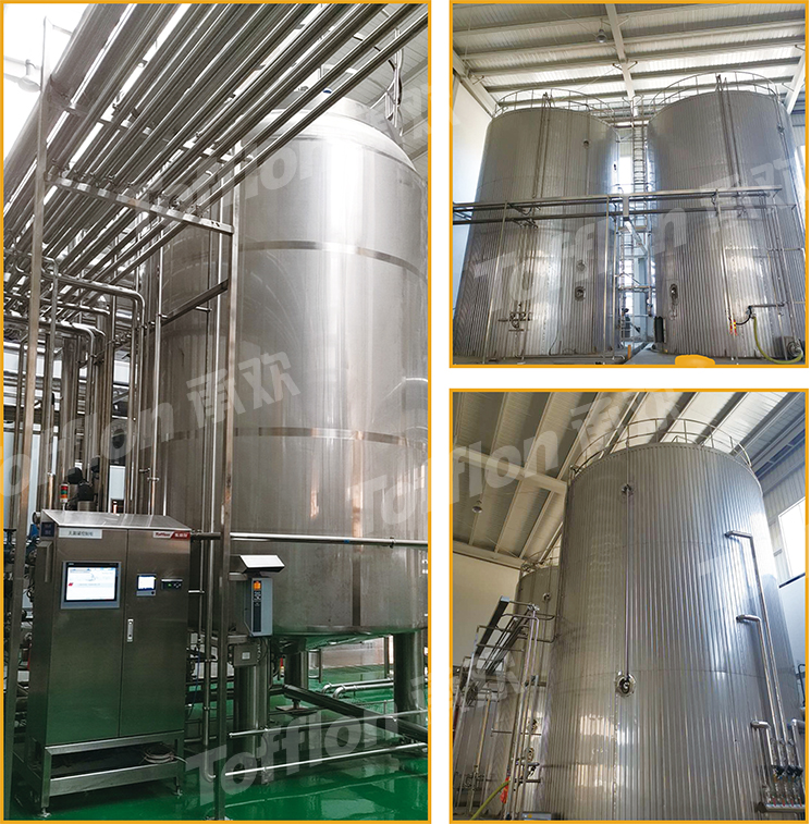 為保證生產(chǎn)中大批量果汁的長(zhǎng)時(shí)間常溫儲(chǔ)存,該線配有我司自主研發(fā)的全自動(dòng)無(wú)菌罐系統(tǒng)、室外無(wú)菌大型儲(chǔ)罐系統(tǒng),從而解決了生產(chǎn)中鮮榨橙汁的大批量?jī)?chǔ)存問(wèn)題,進(jìn)而避免了冷庫(kù)的使用和建設(shè)。