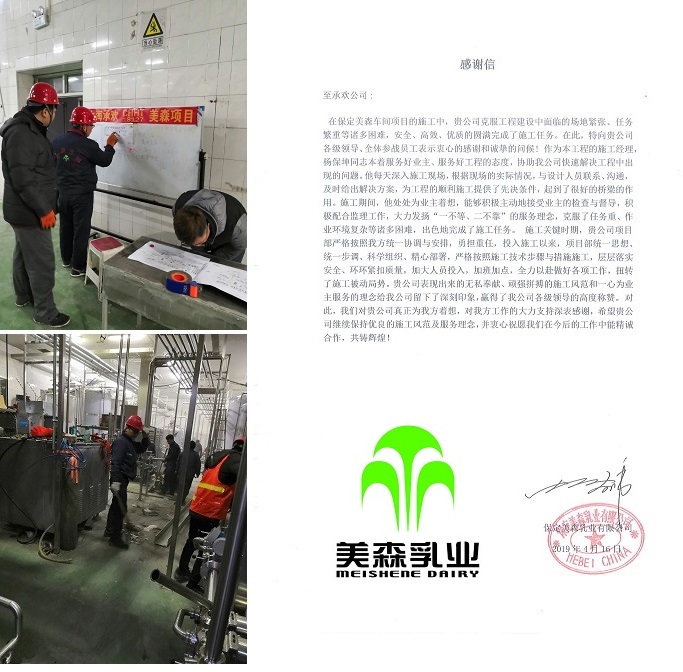 近日,東富龍食品工程事業(yè)部收到了一封來自保定美森乳業(yè)的感謝信,信中對現(xiàn)場人員面臨場地緊張,任務(wù)繁重,環(huán)境復(fù)雜等困難,安全、高效、優(yōu)質(zhì)的圓滿完成施工任務(wù),表示了衷心的感謝,并對東富龍承歡頑強(qiáng)拼搏的施工風(fēng)范和服務(wù)理念,進(jìn)行了高度稱贊!一封感謝信,簡單幾百字,卻飽含美森乳業(yè)對我們的濃濃感激之情,更是對東富龍承歡長期以來不斷提升服務(wù)品質(zhì)的回饋和認(rèn)可!