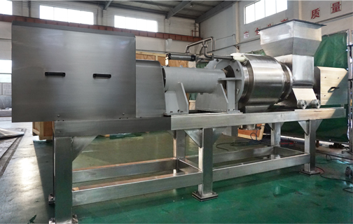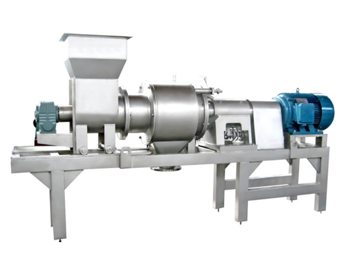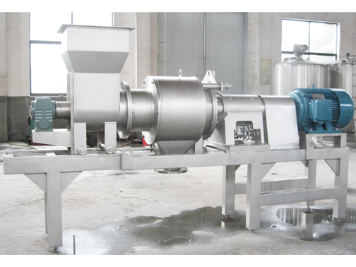 水果或蔬菜被送入料斗中通過料斗內(nèi)的螺旋輸送器在電機(jī)驅(qū)動(dòng)下將原料輸送至與其相連的定子,此定子可以將產(chǎn)品均勻地輸送至后續(xù)的帶葉片的打漿轉(zhuǎn)子,此打漿轉(zhuǎn)子在錐狀不銹鋼篩網(wǎng)內(nèi)轉(zhuǎn)動(dòng)可以完成果汁果肉的提取,從而得到將果皮梗和果籽有效分離的果肉(稱冷提取),此過程中不需要經(jīng)過破碎機(jī);得到的果漿可送到高效的果漿熱交換器通過熱處理對(duì)果漿進(jìn)行滅酶工作;滅酶后的果漿隨即通過螺桿泵送入后續(xù)的熱打漿精制機(jī), 且在酶鈍化溫度下進(jìn)行精制(稱熱提取);然后產(chǎn)品進(jìn)入濃縮、灌裝工段。