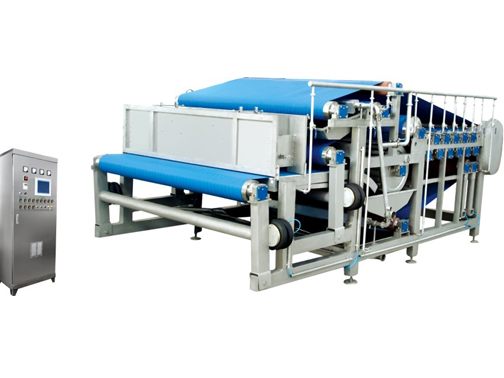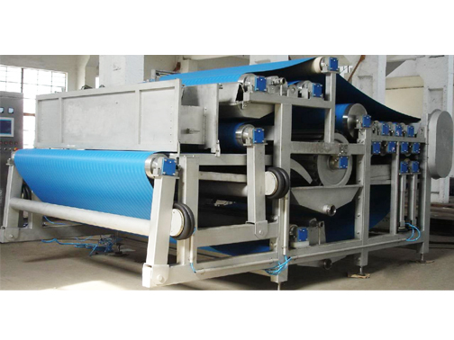 帶式壓榨機主要由不銹鋼機架、壓榨段、驅動裝置、濾帶漲緊裝置、濾帶糾偏系統、收集盤及排放管、電氣控制系統等組成。該設備采用了整齊排列壓榨輥的結構型式,它能連續自動完成上料、壓榨、濾網洗滌、卸渣等工藝操作,并且原液與濾網洗滌液可以分段收集。