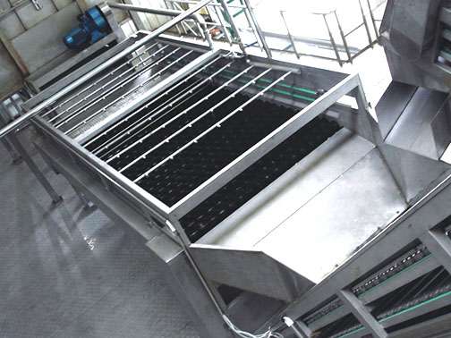 水果由進(jìn)料口進(jìn)入,通過鏈條傳動將水果由進(jìn)料斗向出料斗方向旋轉(zhuǎn)推進(jìn),同時(shí)開啟自動清洗噴淋。