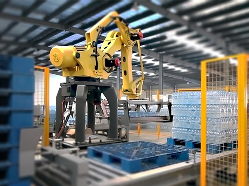 機(jī)器人碼垛機(jī)可以集成在任何生產(chǎn)線中,為生產(chǎn)現(xiàn)場(chǎng)提供智能化、機(jī)器人化、網(wǎng)絡(luò)化,可以實(shí)現(xiàn)啤酒、飲料和食品行業(yè)多種多樣作業(yè)的碼垛物流,廣泛應(yīng)用于紙箱、塑料箱、瓶類、袋類、桶裝、膜包產(chǎn)品及灌裝產(chǎn)品等。配套于三合一灌裝線等,對(duì)各類瓶罐箱包進(jìn)行碼垛。